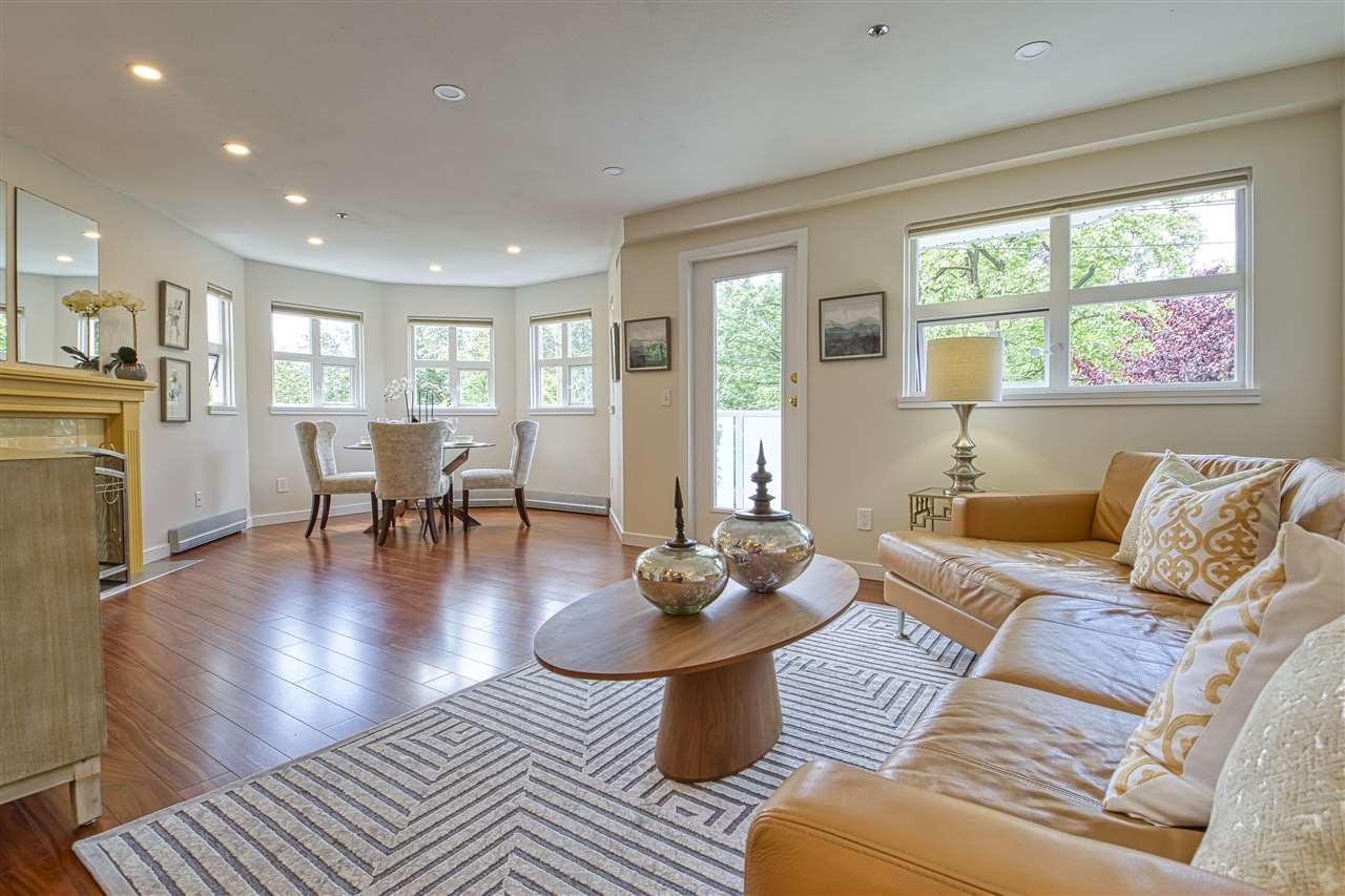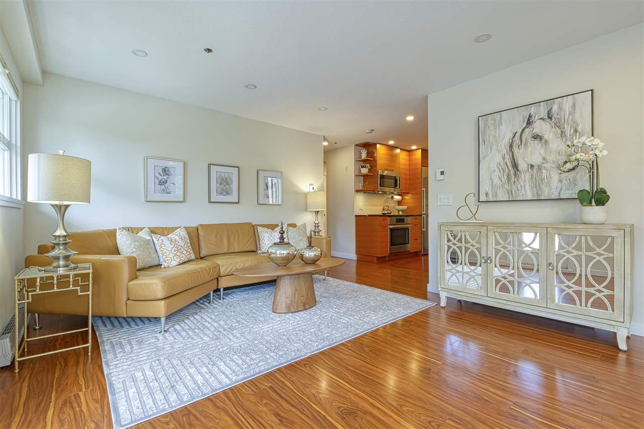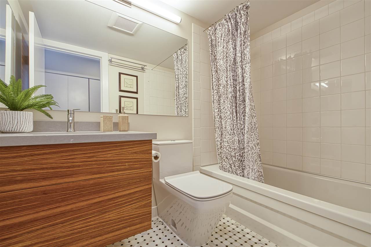 Welcome to Woodland Terrace! An incredibly well run complex just off iconic Commercial Drive – home to restaurants, bars, music, transit, with a bike route literally outside your door. Beautifully updated 2bdrm/2bath SW CORNER unit is bathed in natural light. Dream kitchen with custom fir doors and solid wood cabinetry, soapstone counters and Bosch appliances. On summer nights make use of the thermal blackout blinds or change the mood anytime with dimmable LED pot lights throughout. Main bath is stunning w/octagon and dot marble tiles and genuine teak floating vanity. The list goes on with soundproof, solid core doors and programmable digital thermostats. 2 balconies! INSUITE LAUNDRY. Parking/storage incl. Pet friendly but sorry NO rentals. Call for your private COVID-friendly showing.