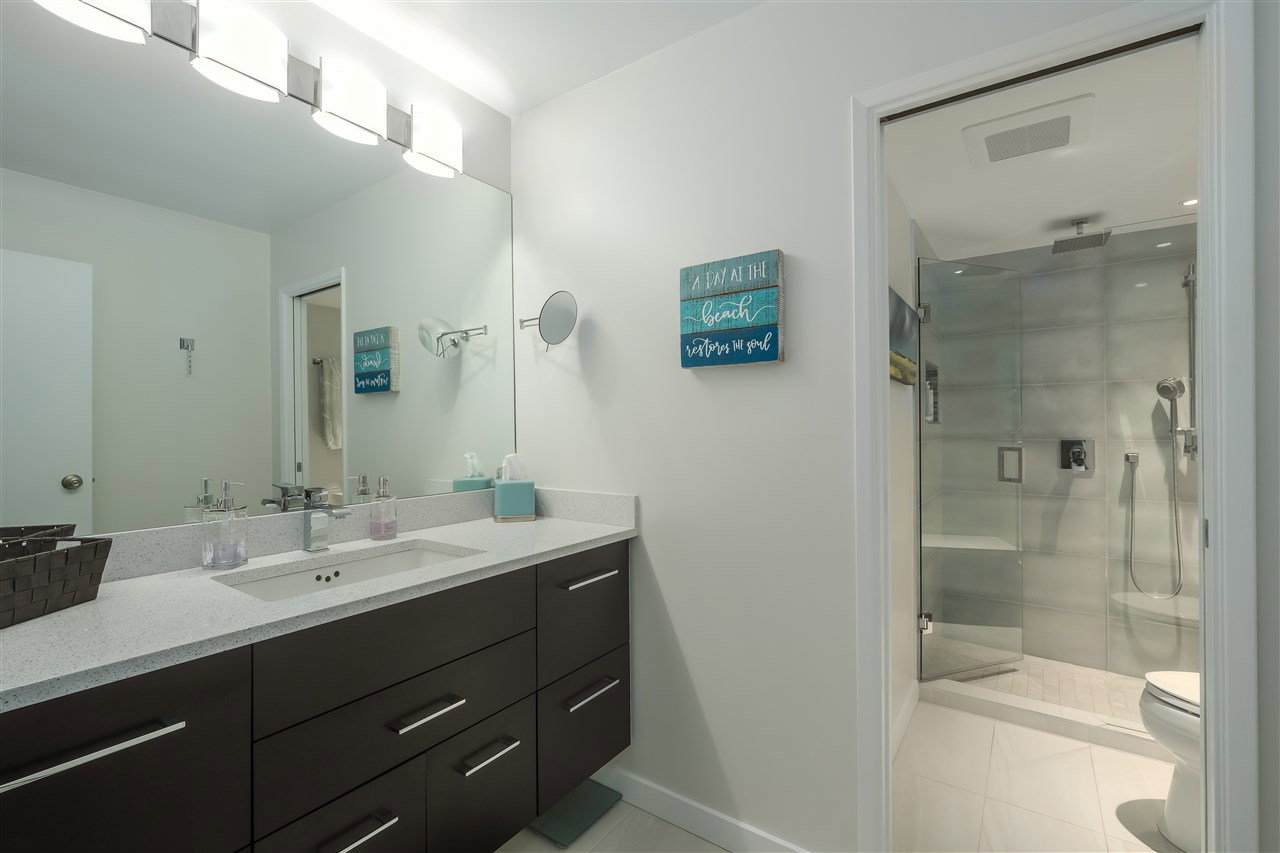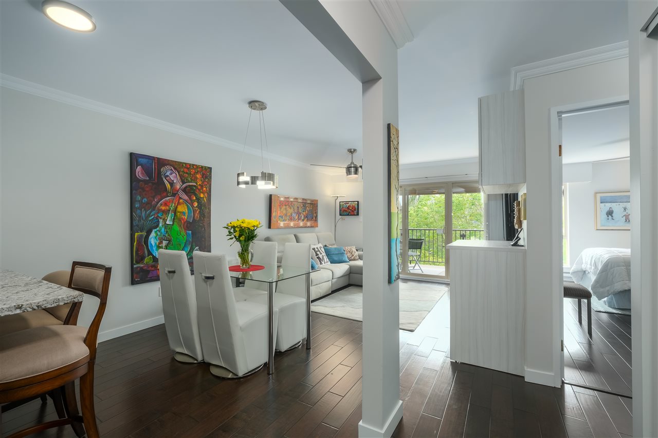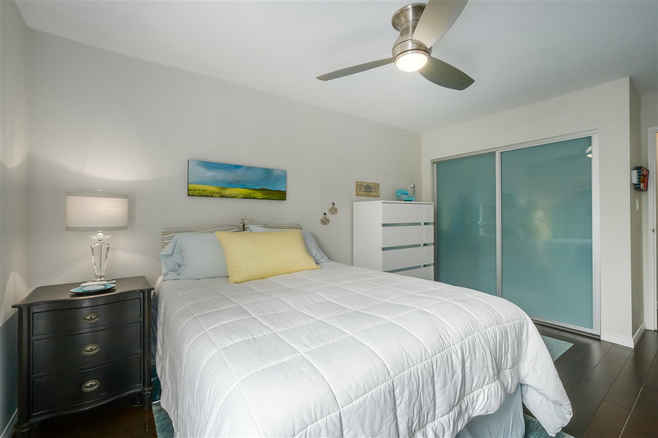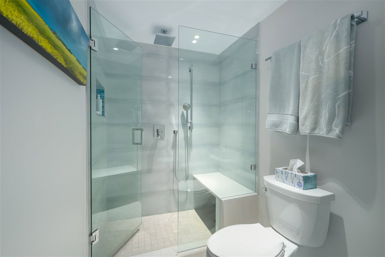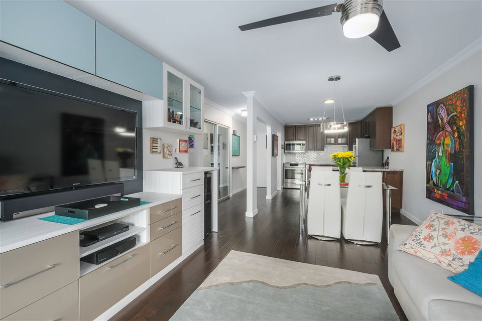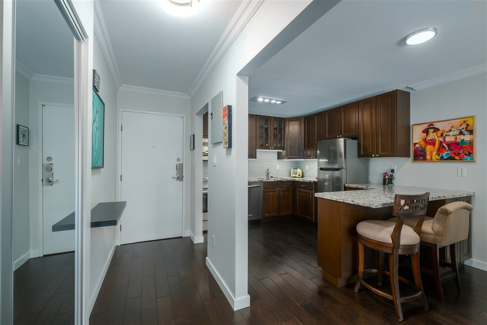 Prepare to be impressed!! This extraordinary TOP floor S.FACING 1 bdrm has been meticulously maintained and it shows. From the reno’d open concept kitchen with new Bosch stove/oven and micro, LG fridge, and a great breakfast bar to the exceptional bath redo by Maison d’Etre w/floating vanity and walk-in shower (rain shower head). King sized bdrm, new stackable LG washer/dryer, remote controlled Hunter Douglas blinds, pristine engineered hardwood flooring, and generous living/dining area.. California Closets have worked their magic throughout. Come cocktail hour head to the deck to catch the last rays. Stellar building w/proactive strata. Parking/storage/bike room. A stone’s throw from all S.Granville had to offer. Be quick but COVID procedures in place for showing.