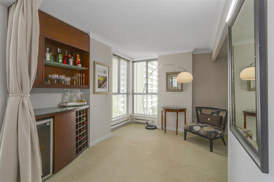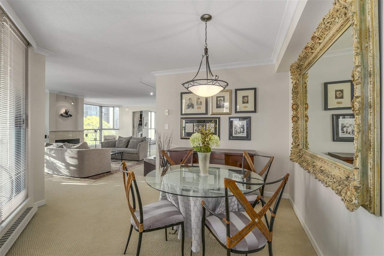 A truly elegant space – will be your first impression as you enter this almost 1300 sq.ft. unit with an impeccable open floor plan. a true foyer draws you in to a spacious living room freshly painted in tones that further accentuate the serene atmosphere. Curl up in front of the fire and watch the leaves fall. Many upgrades, including built-in custom millwork in bedrooms and bathrooms. Kitchen has a separate eating area and is its own space, complete with large windows and a balcony perfect for barbecuing. Another balcony, capturing the morning sun, graces the second bedroom which is currently used as a den. Only 3 suites per floor. Mere steps to Robson St. yet worlds away. OPEN HOUSE cancelled. Property has sold firm.